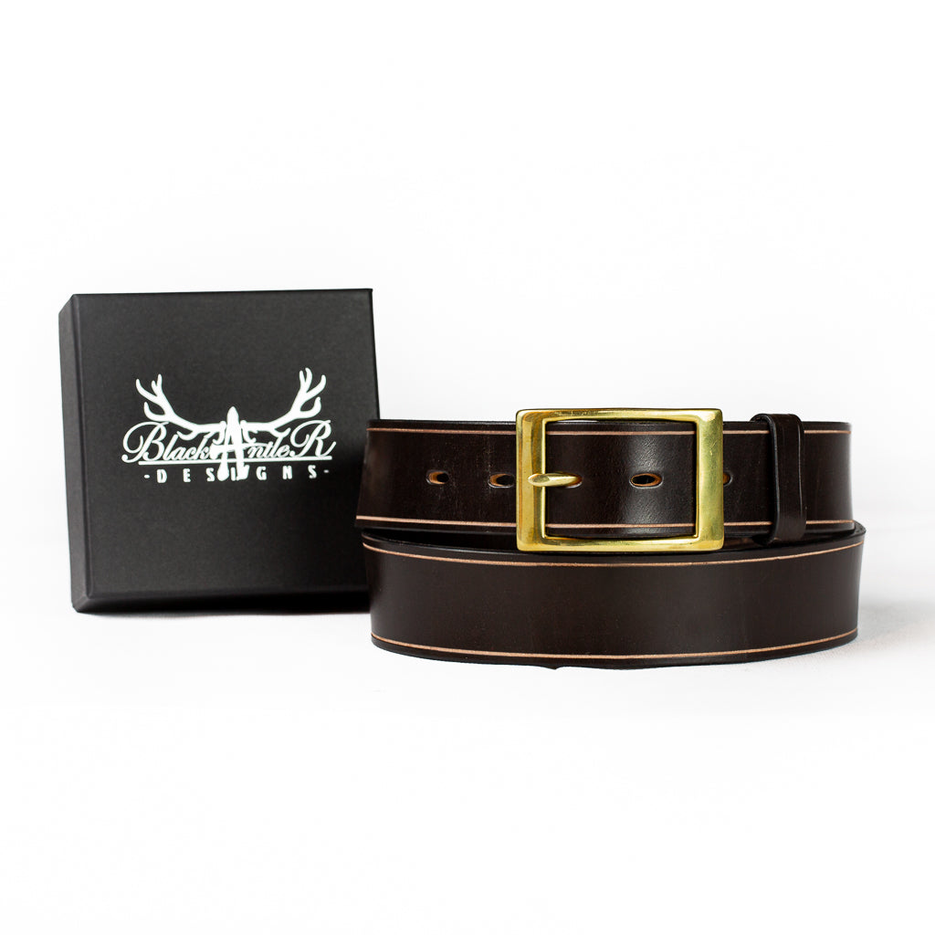 These hand made belts are made from J&E Sedgwick’s bridle leather, which is produced in the UK and is renowned the world over for its fine quality. The surface has been worked to give a smooth and beautifully even finish, making it easy to maintain. As this leather ages it gains beautiful character and patina. All of our Sedgwick leather belts are 3.5 – 4.5mm thick and 38mm (1.5 inches) wide. The buckles are made in one of the last remaining brass buckle foundries in the UK, and are available in four different finishes.